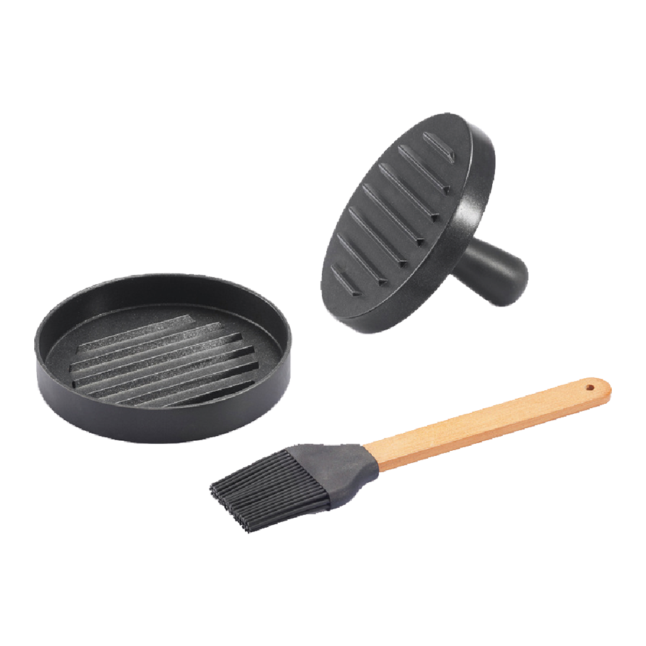 Hamburger set met hamburger pers en barbecue kwast. De set om de perfecte hamburger te maken!